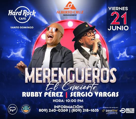 (Santo Domingo, 27 de mayo de 2024).- La empresa Alberto Cruz Management anuncia un evento espectacular para los amantes del merengue: el concierto "Merengueros", que contará con la participación de dos gigantes de la música, Rubby Pérez y Sergio Vargas. Este evento tendrá lugar el viernes 21 de junio a las 9:00 pm, prometiendo una noche llena de energía y ritmo contagioso.