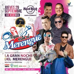 Con el concierto bailable “La gran noche del merengue”, a realizarse el 29 de septiembre en Hard Rock Café, será celebrado el séptimo aniversario del programa radial “Aquí está el merengue”, que se transmite cada sábado por Rumba 98.5.